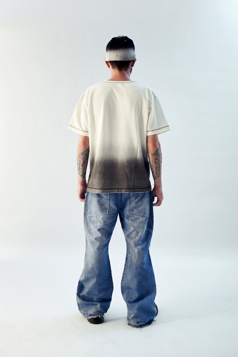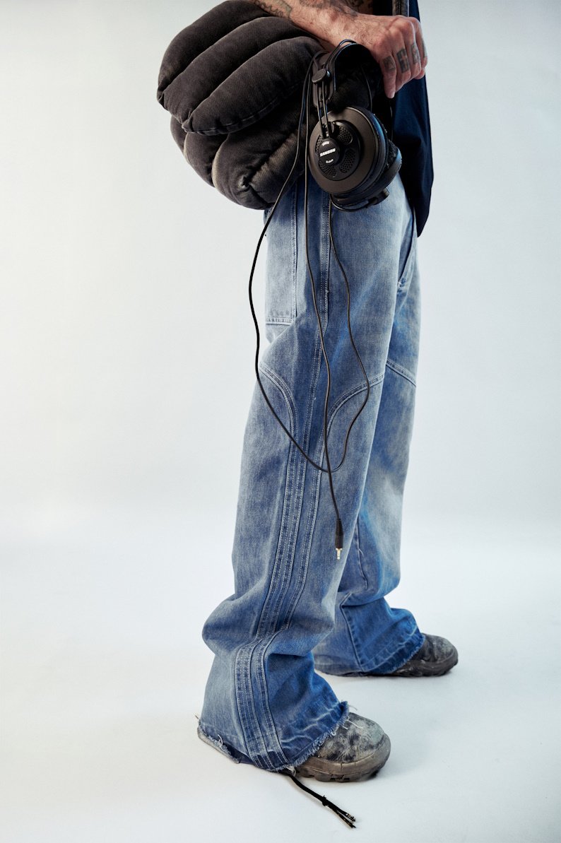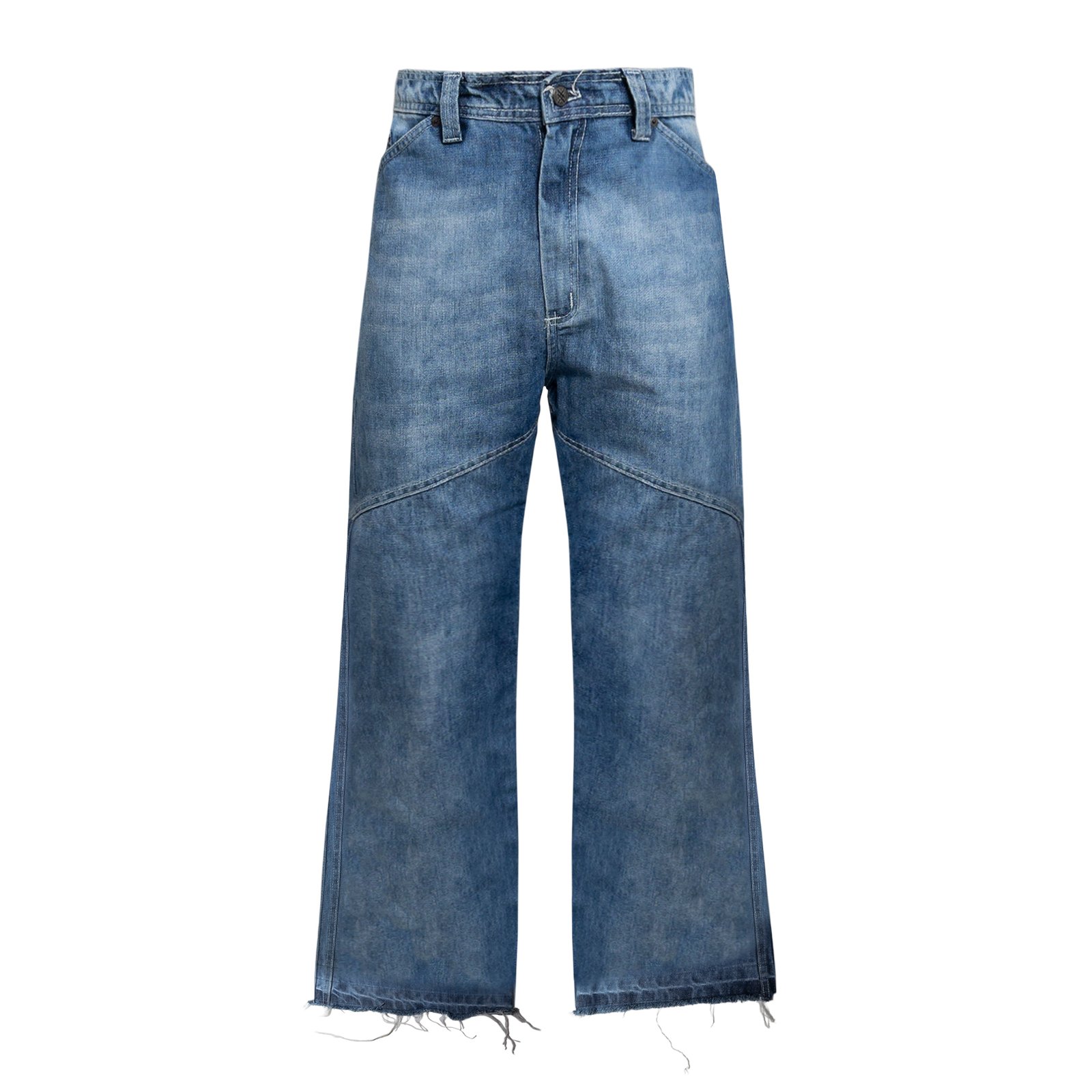 Confeccionada em jeanas 100% algodão 11 oz, com fechamento em zíper YKK, botões e etiquetas personalizadas AMNI, e modelagem flare.