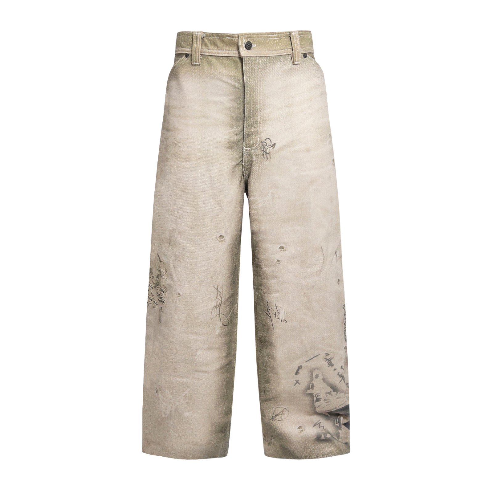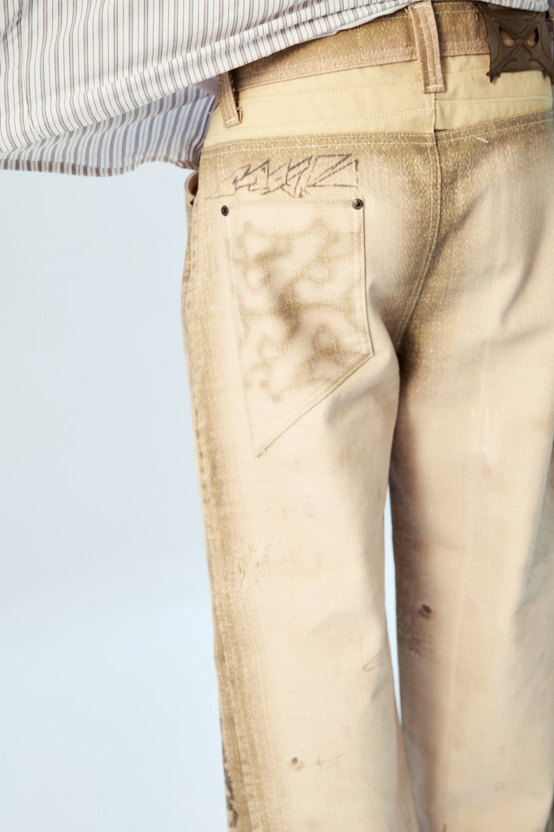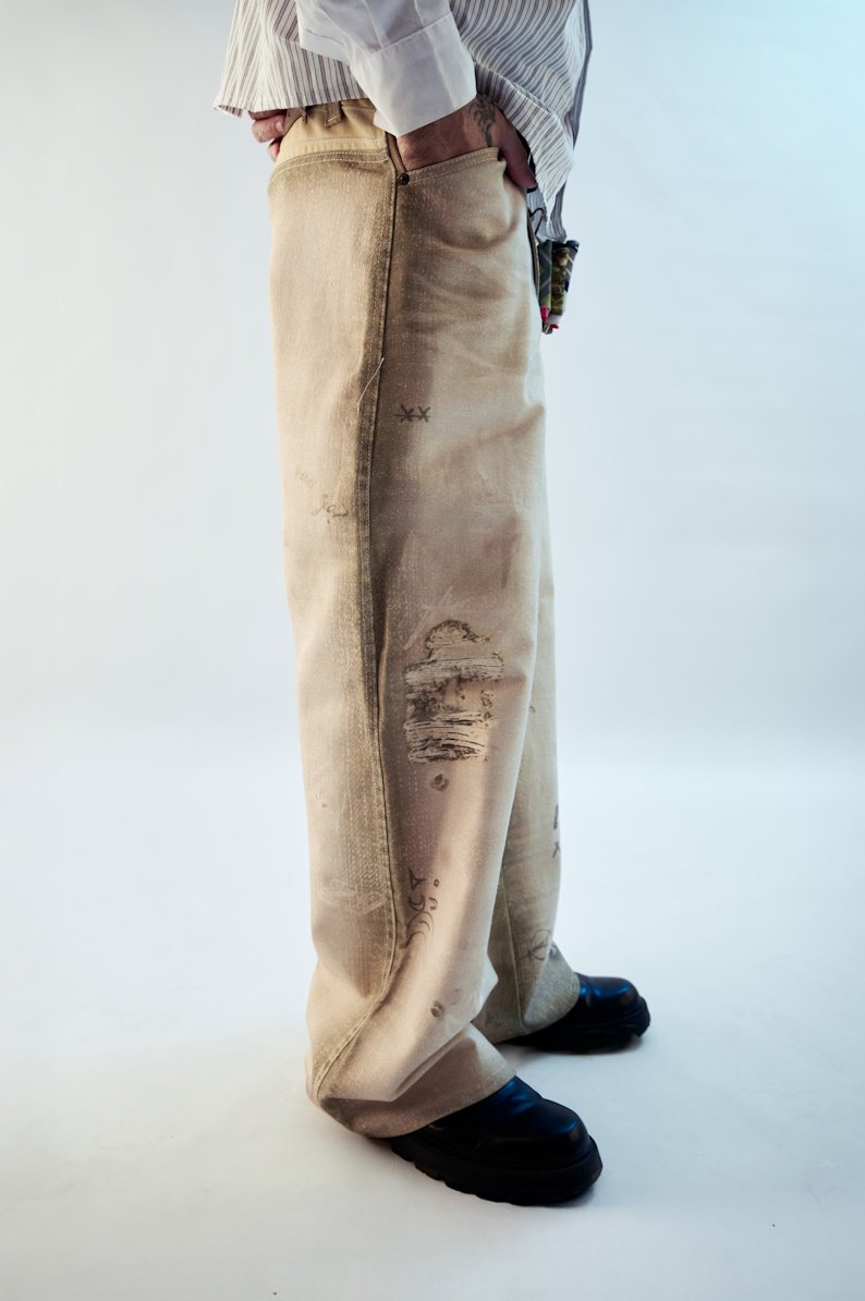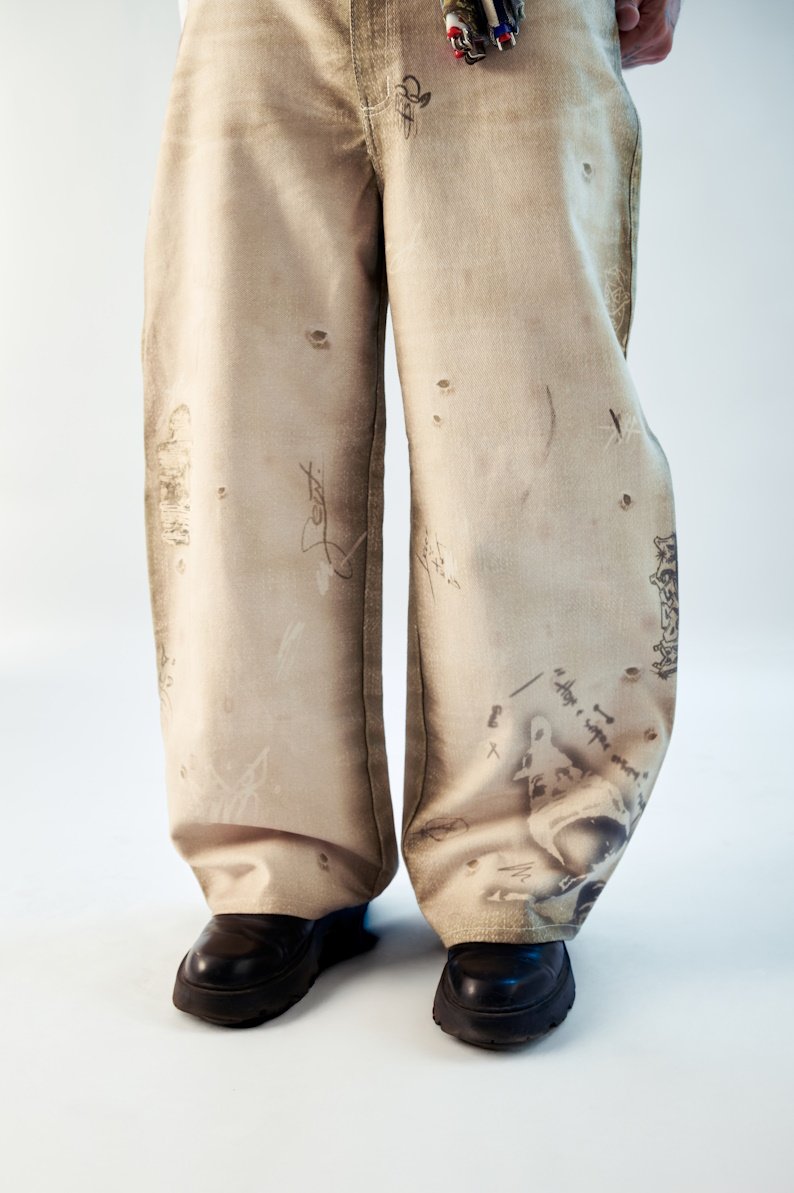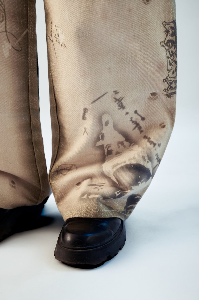 Feita em brim ecológico 100% algodão, toda sua textura — pichações, marcas, rasuras — é construída digitalmente, tornando o processo mais sustentável. Cada camada carrega a ideia de caminhada e desenvolvimento: rascunho, erro, correção, avanço.