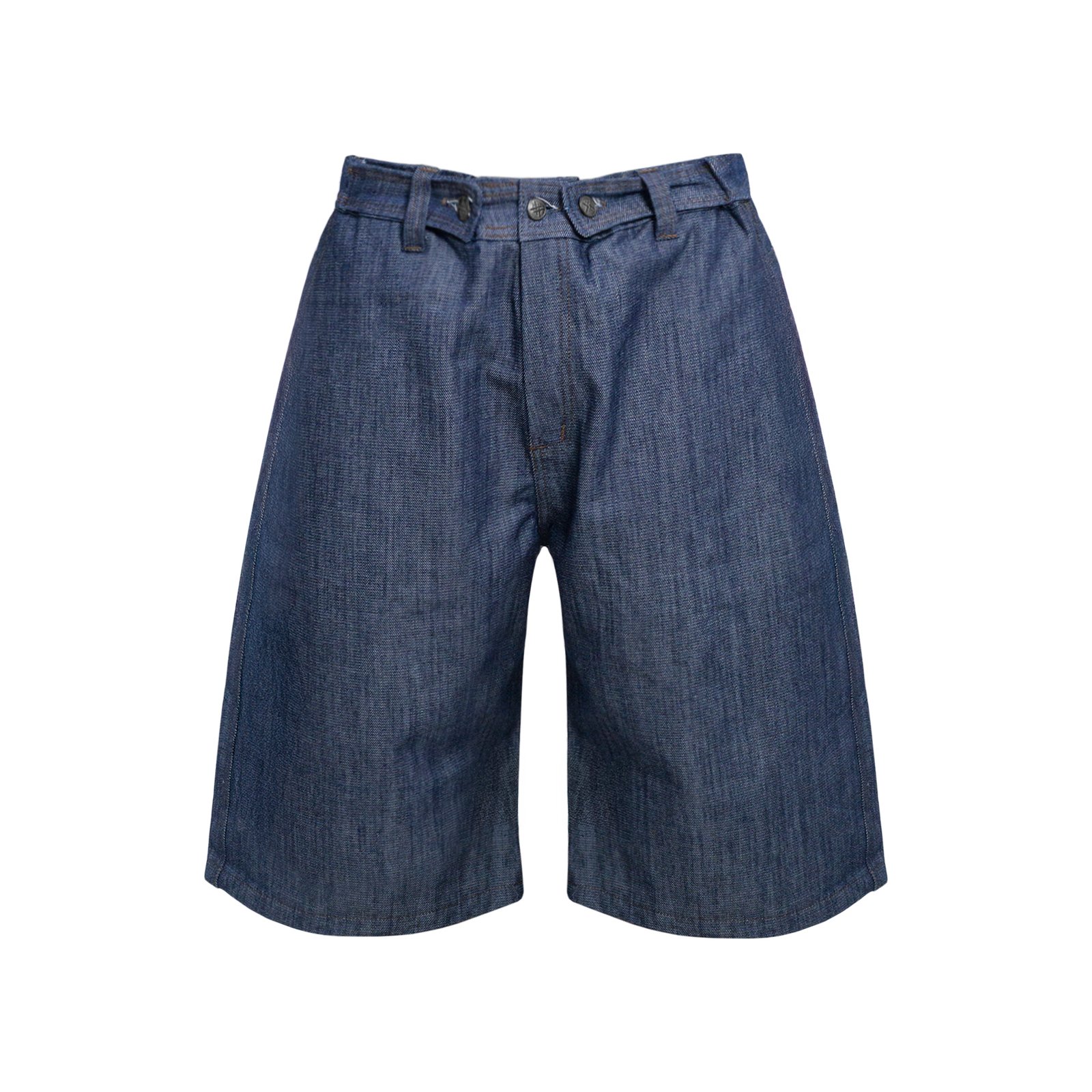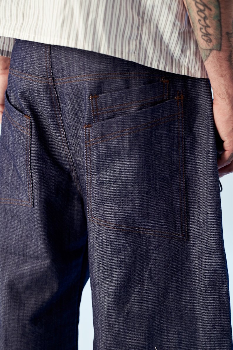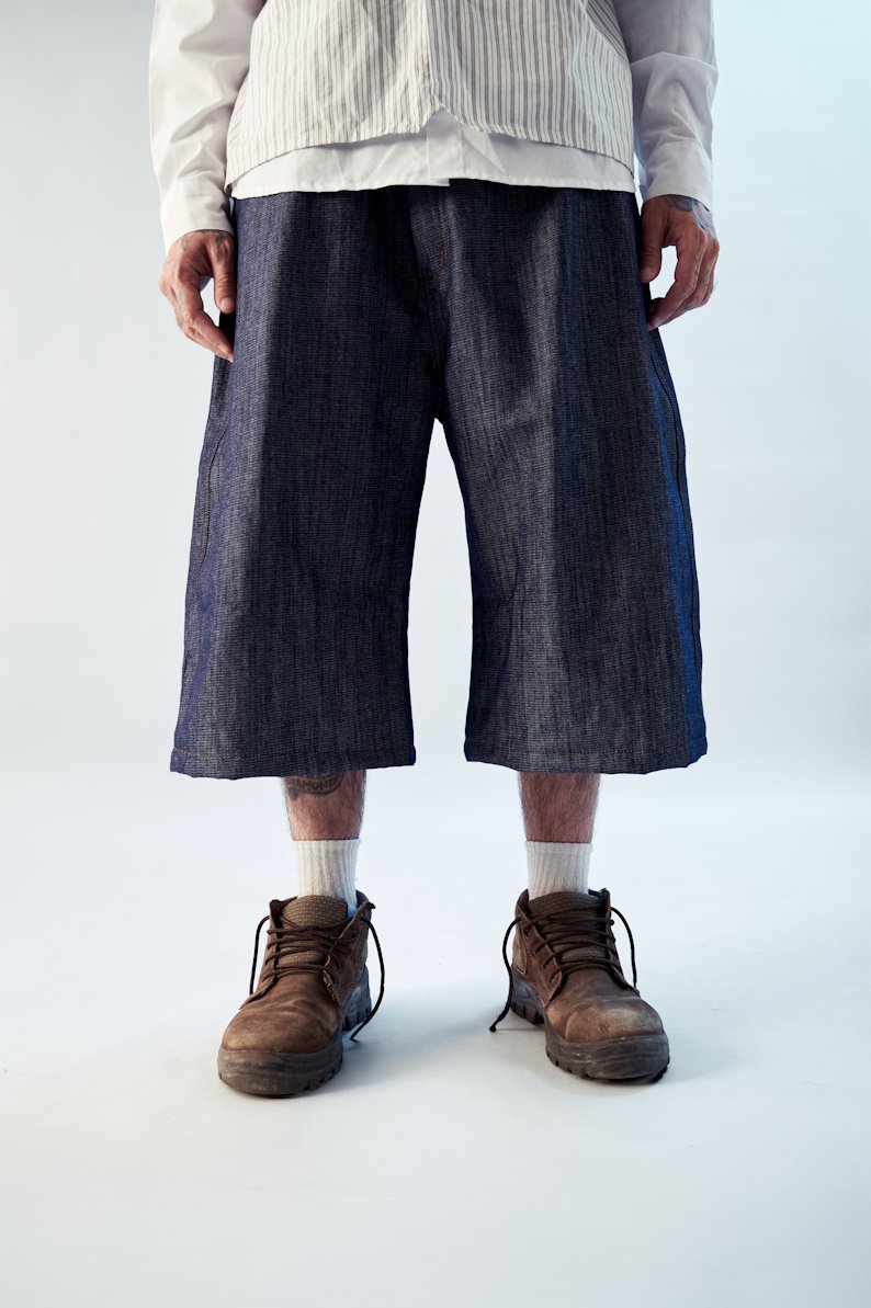 Confeccionado em jeanas 100% algodão 11 oz, com zíper YKK, botões e etiquetas personalizadas AMNI, e modelagem jorts.